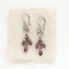 Delicate blossoms blooming in the late desert sun. Rich trios of phosphosiderite and rubies dangle below darling stamped silver flowers. For the modern bohemian. Handmade Shepherd hook earwires. Measure 1 3/4”. Sterling silver, which has been oxidized and hand polished for an antique finish.