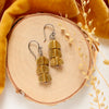 Inspired by ancient cultures. Architectural stacks of brass elements. Rich and inviting. Handmade Shepherd hook earwires. Measure 1 1/2”. Sterling silver, which has been oxidized and hand polished for an antique finish.