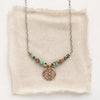 Made for the wanderer at heart. A rich layered bronze element adorns a dreamy mix of dalmatian jasper, african jasper, and brown zircon with little brass accents. For the modern bohemian. Chain measures 17-18” with lobster clasp and adjustable length chain closure. Sterling silver, which has been oxidized and hand polished for an antique finish.